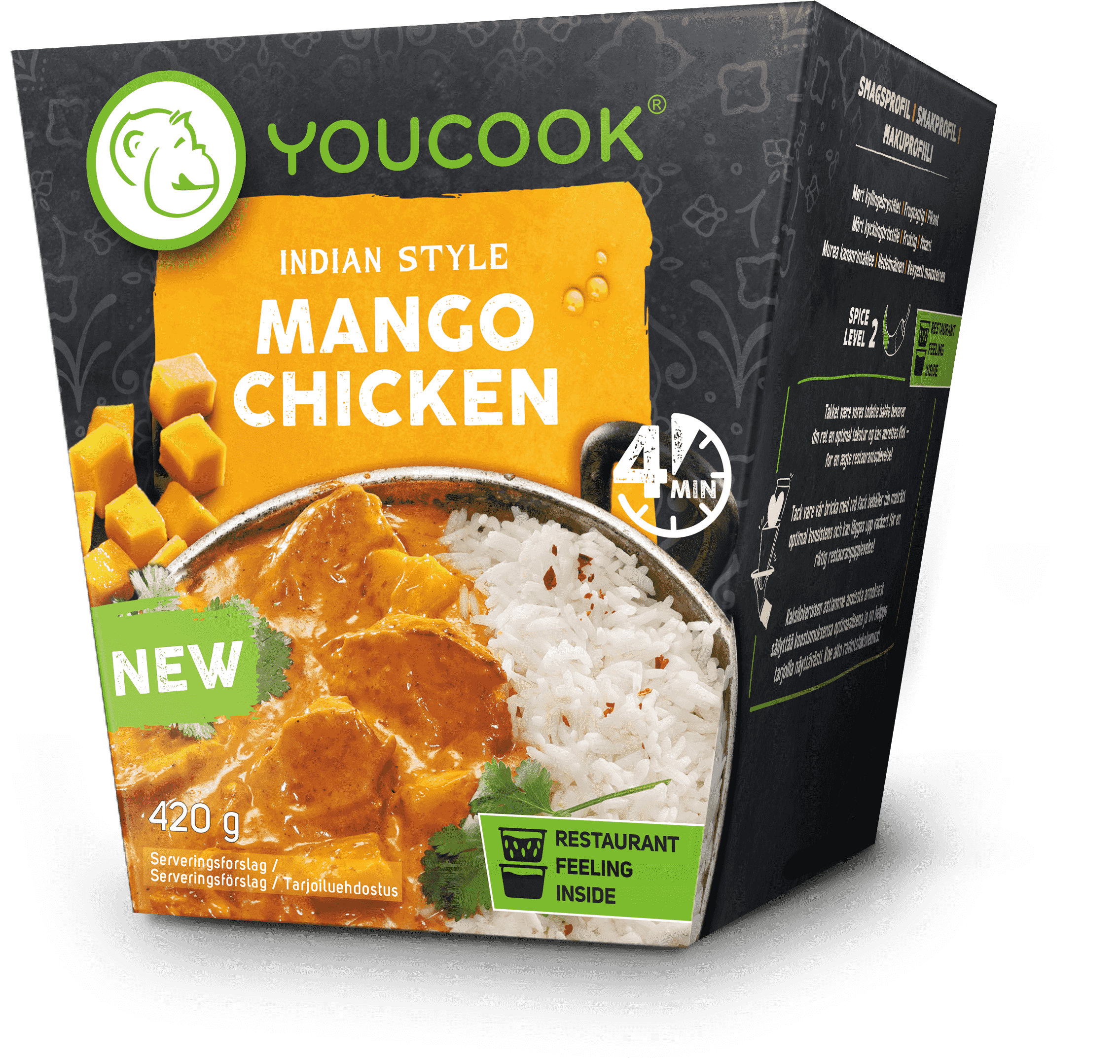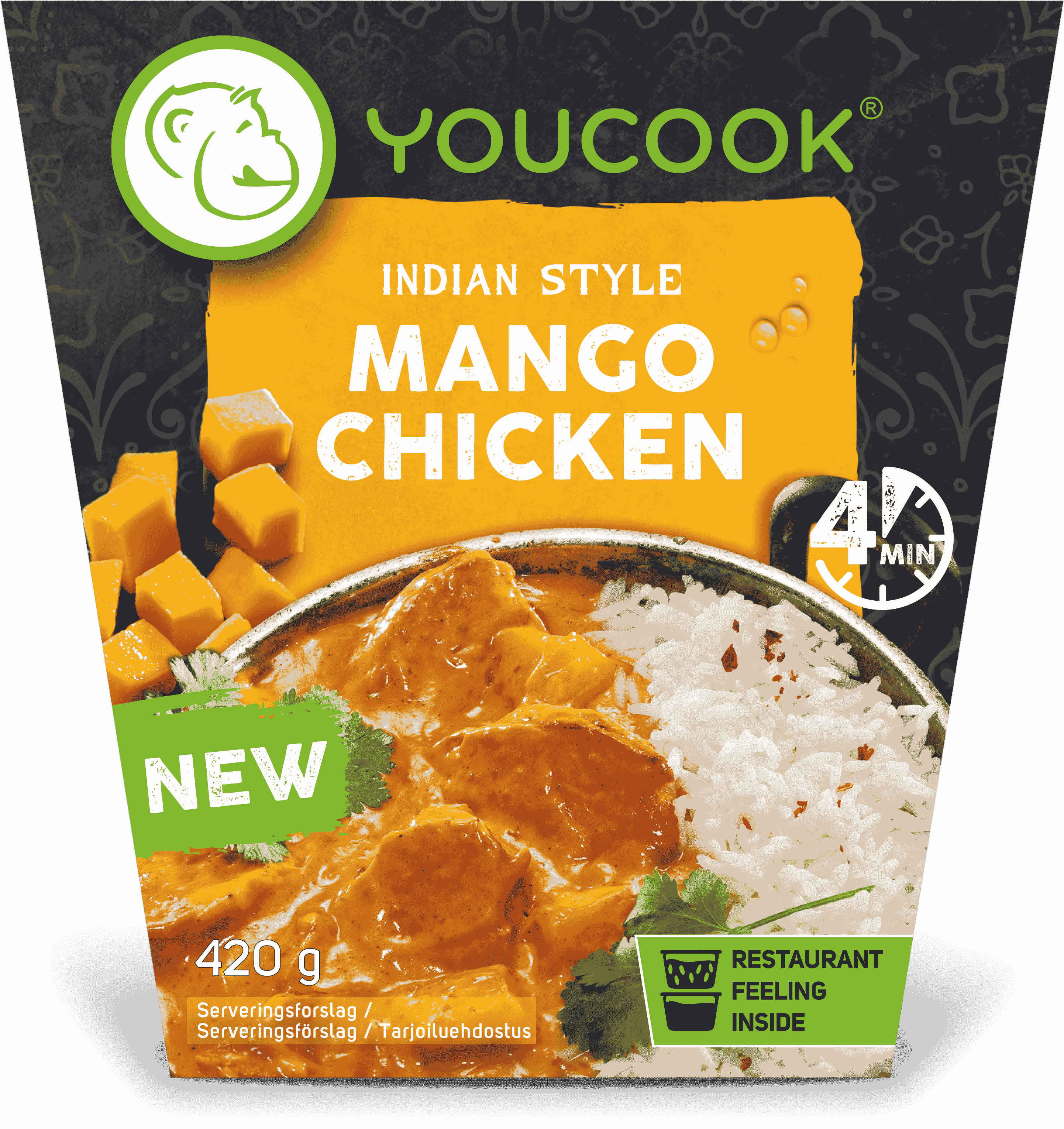 Ingredients: cooked rice 43% (water, basmati rice 27%, jasmine rice 11%, rapeseed oil), CREAM, marinated, cooked chicken breast fillet 12% (chicken breast fillet, starch, salt, dextrose, contains soya oil and/or rapeseed oil), mango 12%, YOGURT, water, spices, tomato concentrate, sugar, rapeseed oil, salt, modified starch, coconut milk powder (coconut milk, maltodextrin, MILK protein), lemon juice concentrate, distilled vinegar, peppers extract. Enthalten: Milch Kann Spuren enthalten von: Glutenhaltiges Getreide, Eier, Sojabohnen, Sellerie Geschmacksverstärker The best before date indicated on the sales packaging can only be guaranteed if the product is stored and transported continuously at temperatures between +2°C and +7°C. So schnell, so lecker. Ready in 4 Minuten. Pierce the top of both bowls multiple times and heat in the microwave (700 watts) for about 4 minutes. Open both bowls and place the side and the sauce with meat and vegetables in a pan with a dash of oil. Heat over a medium heat, stirring occasionally. Then just dish up on your favourite plate and enjoy. Please note: cooking times may vary depending on the appliance. Extra tasty and just the way you like it – with fresh ingredients straight from the supermarket. PRODUCT DETAILS
