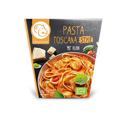 Unsere Pasta Toscana Style überzeugt mit zartem Hähnchenbrustfilet in einer besonders cremigen Tomaten-Mascarpone-Sauce. 420g ARTIKELDATEN |
