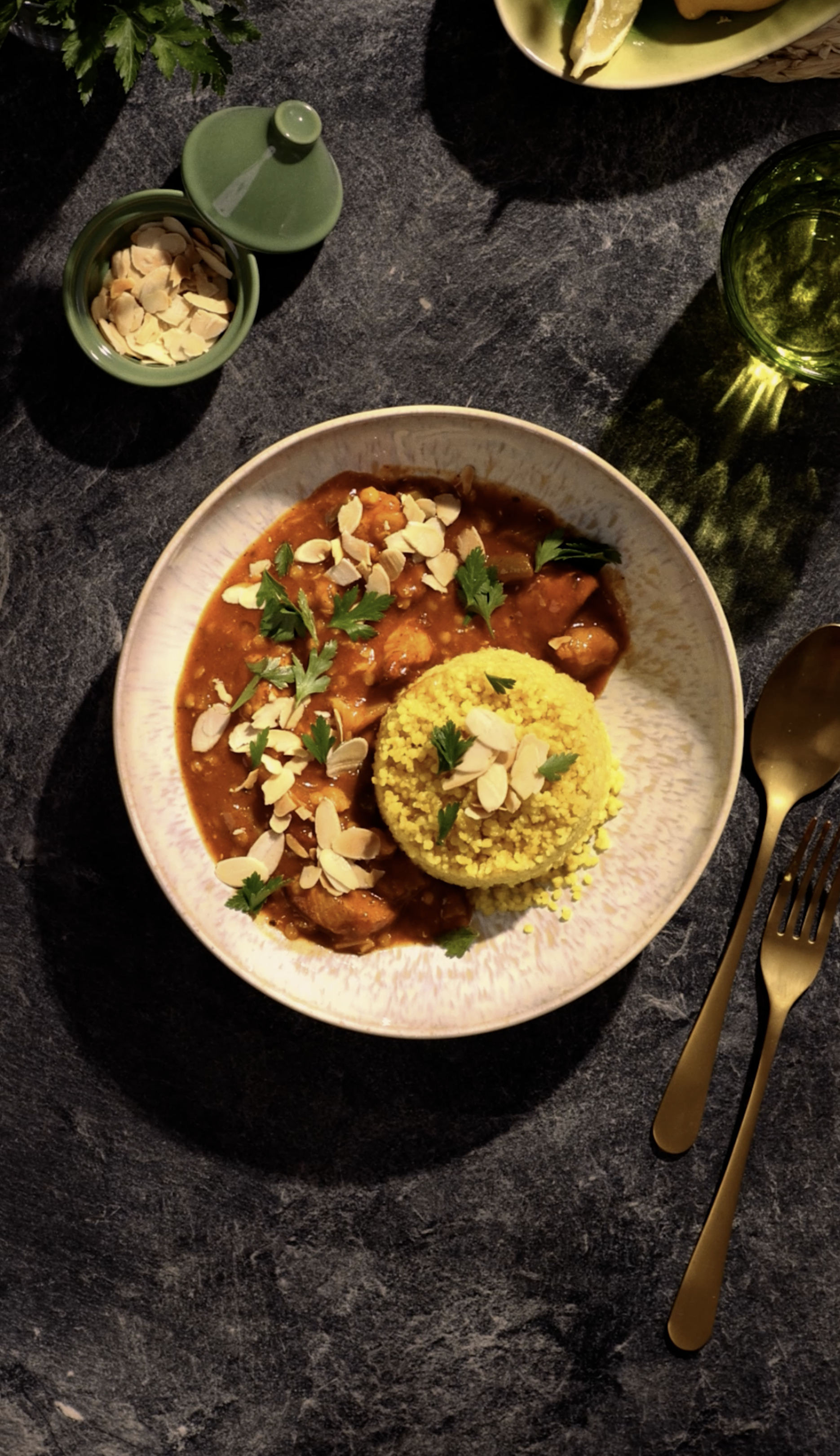 Tauche mit der Moroccan Style Chicken Tajine ein in neue Geschmackswelten. In einer orientalisch-würzigen Sauce vereinen sich saftiges Hähnchen und eine bunte Gemüseauswahl. Serviert wird dazu luftiger Couscous – eine echte Neuheit. Ein Genuss, der die Sinne auf Reisen schickt!