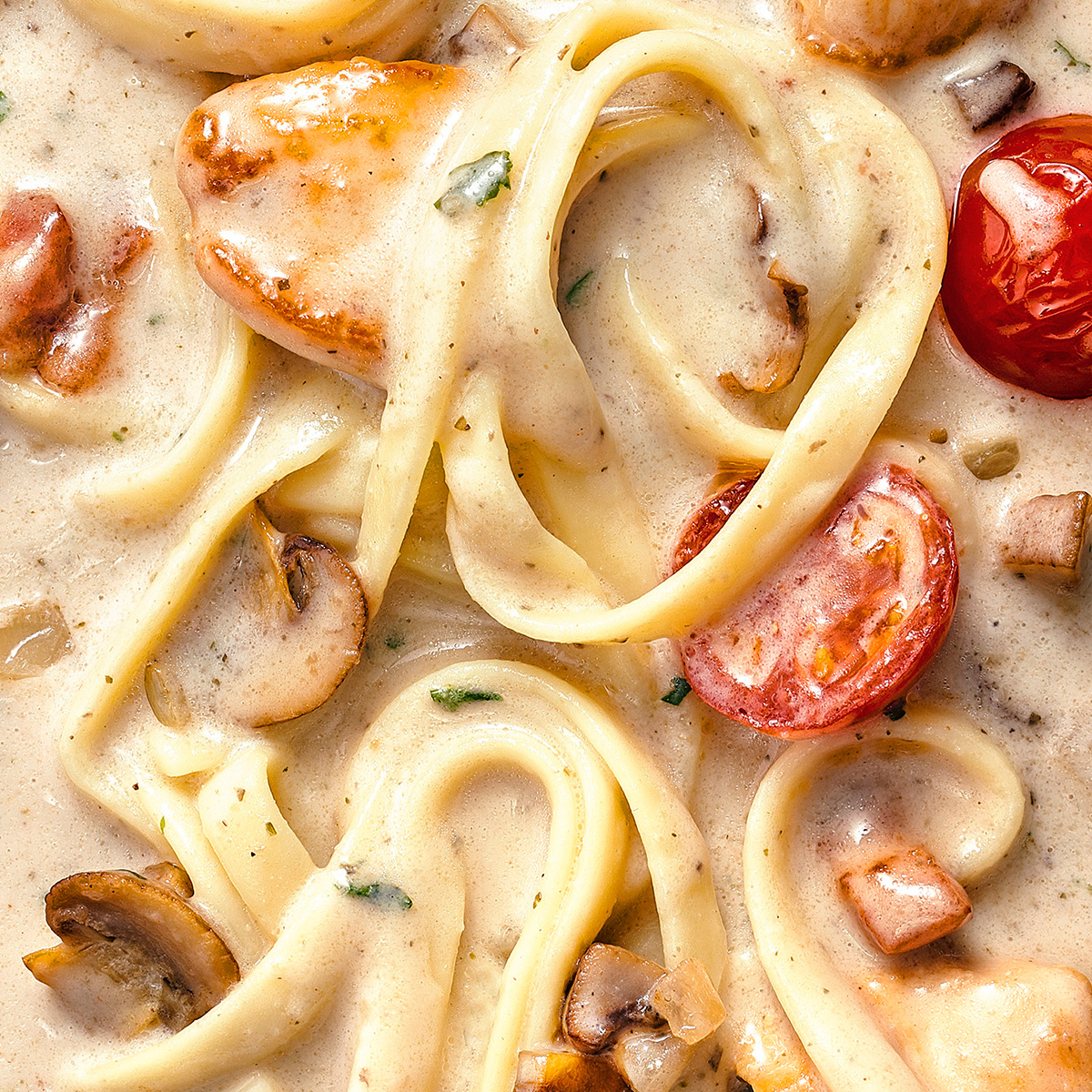 Zutaten: 43% gegarte Nudeln (Wasser, HARTWEIZENGRIEß, Rapsöl), Wasser, 9% SAHNE, 9% Hähnchenbrustfilet mariniert, gegart (Hähnchenbrustfilet, Stärke, Salz, Dextrose, enthält Sojaöl und/oder Rapsöl), CRÈME FRAÎCHE, Tomaten, Champignons, geriebener Grana Padano KÄSE (enthält EI), Zwiebeln, Rapsöl, Bauchspeck geräuchert (Schweinebauch, Salz, Stabilisator: Natriumnitrit; Rauch), modifizierte Stärke, Salz, Kräuter, Gewürze (enthält SENF), Geflügelbrühe (Puten- und Hühnerbrühe, Salz), Worcestersauce (Wasser, Zucker, GERSTENMALZEXTRAKT, Tomatenmark, Weinessig, Salz, Speisewürze, Wein, Gewürzextrakt), Zwiebelpulver geräuchert (Zwiebeln, Rauch), Zitronensaftkonzentrat, Branntweinessig. Enthalten: Glutenhaltiges Getreide, Eier, Milch, Senf Kann Spuren enthalten von: Sojabohnen, Sellerie Geschmacksverstärker Das auf der Verkaufsverpackung angegebene Mindesthaltbarkeitsdatum kann nur bei einer ununterbrochenen Lagerung und Transport von +2°C bis +7°C eingehalten werden. So schnell, so lecker. Ready in 4 Minuten. Beide Schälchen oben mehrfach einstechen und in der Mikrowelle (700 Watt) für ca. 4 Min. erwärmen. Beide Schälchen öffnen und Pasta sowie Sauce mit Fleisch und Gemüse mit etwas Öl in Pfanne oder Topf geben. Bei mittlerer Hitze erwärmen und ab und zu umrühren. Danach nur noch auf deinem Lieblingsteller anrichten und genießen. Achtung: Die Kochzeit kann je nach Gerät variieren. Extra gut und ganz nach deinem Geschmack – mit frischen Zutaten direkt aus dem Markt. PRODUKTDETAILS