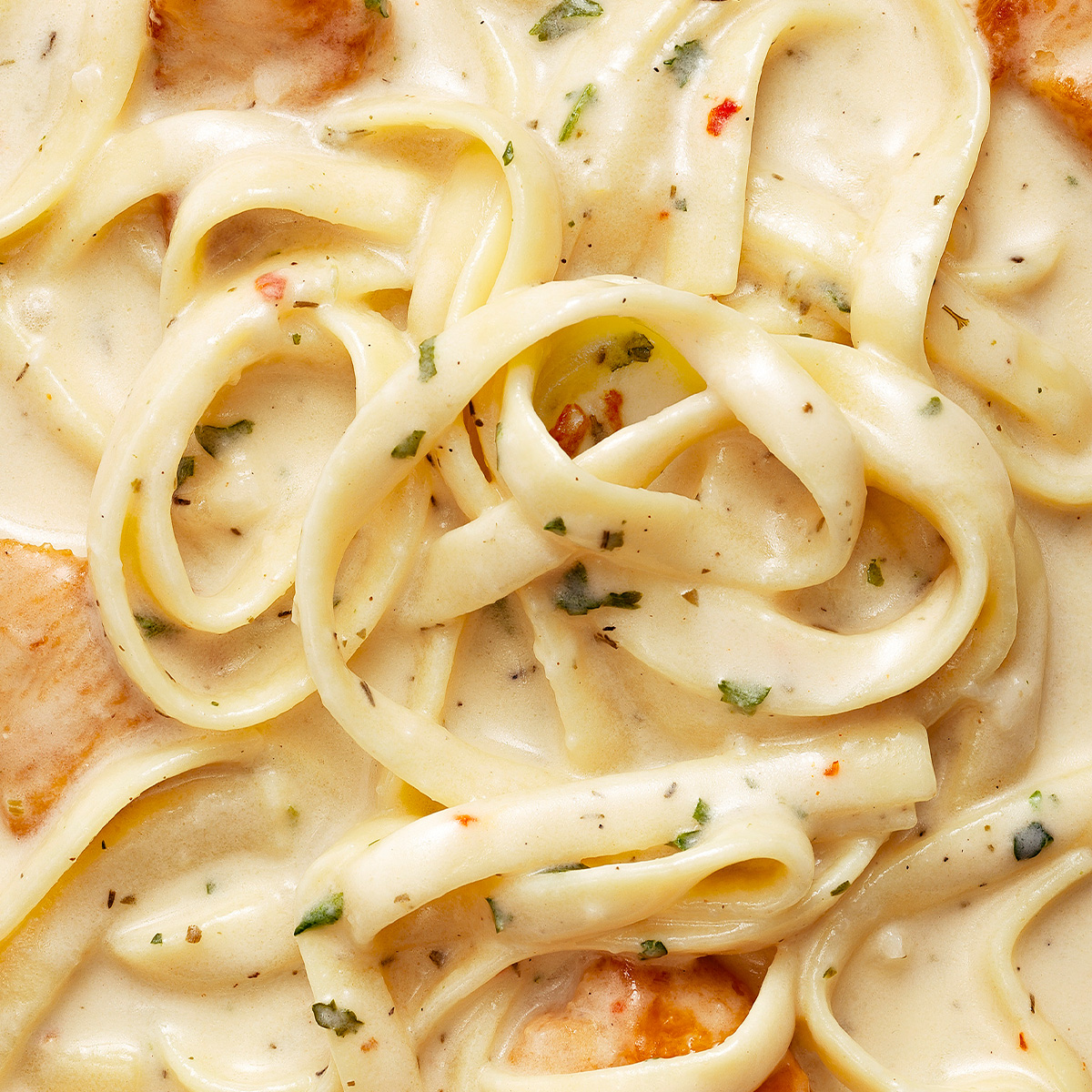 Die Pasta Chicken Alfredo zaubert dich von deiner Küche direkt nach Bella Italia. Das zarte Hähnchenbrustfilet in einer cremigen Sahne-Sauce wird auf Linguine serviert und beschert dir einen vollendeten Genussmoment, der diese Kreation schnell zu einem deiner Favoriten machen wird.