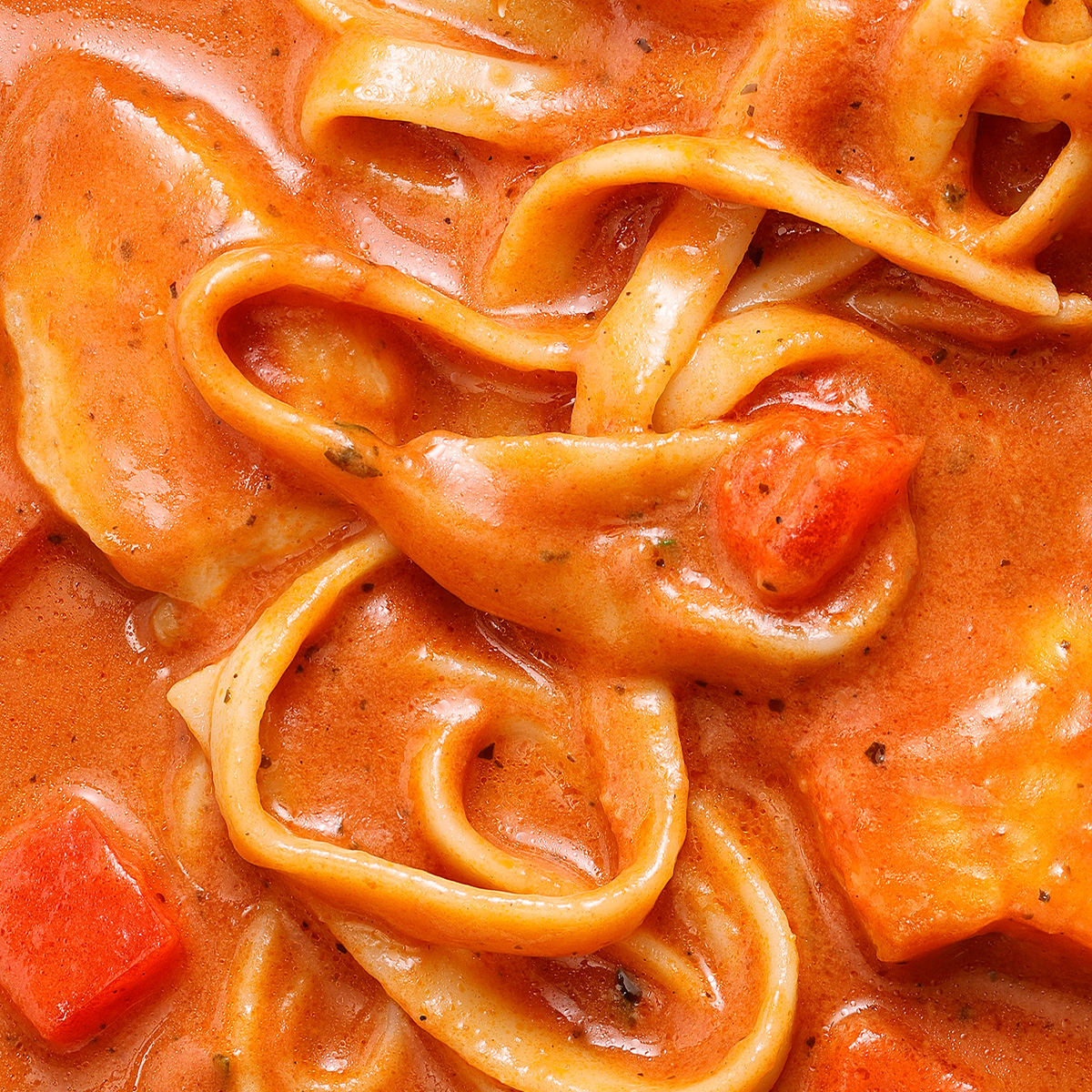 Unsere Pasta Toscana Style überzeugt mit zartem Hähnchenbrustfilet in einer besonders cremigen Tomaten-Mascarpone-Sauce.